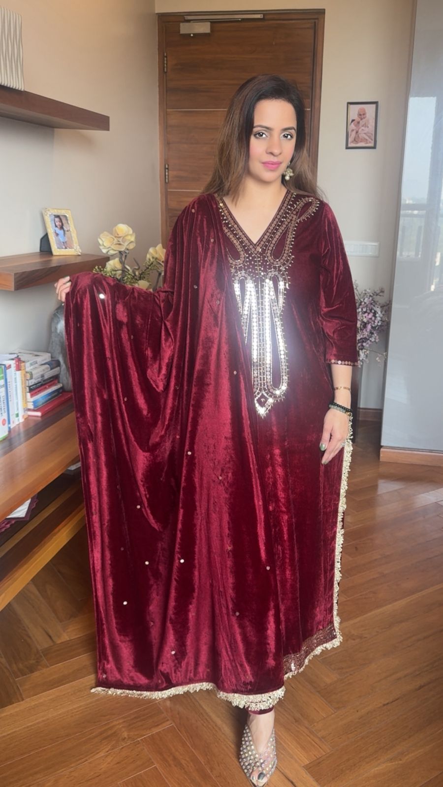 Velvet kurta–pant set adorned with intricate sippi cutdana handwork, elegant lace detailing, and a soft cotton lining.