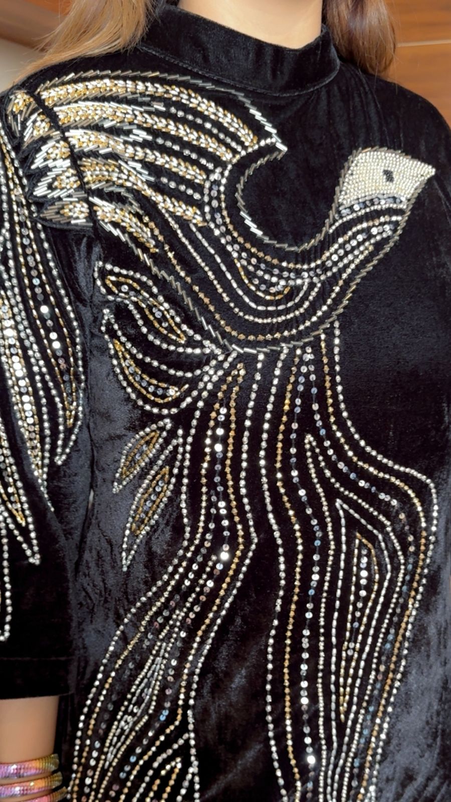 Slay in our Velvet Bird Cordset — adorned with exquisite cutdana and moti bird handwork on one side.